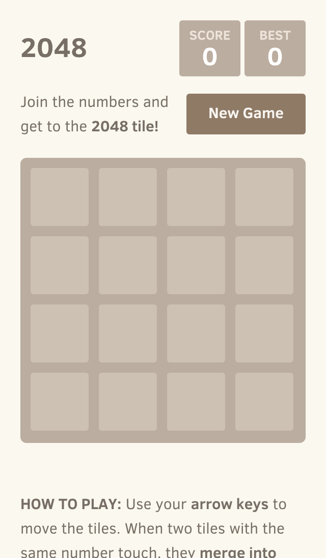 Как играть: Используйте стрелки для перемещения плиток. Когда две плитки с одинаковым номером соприкасаются, они сливаются в одну!